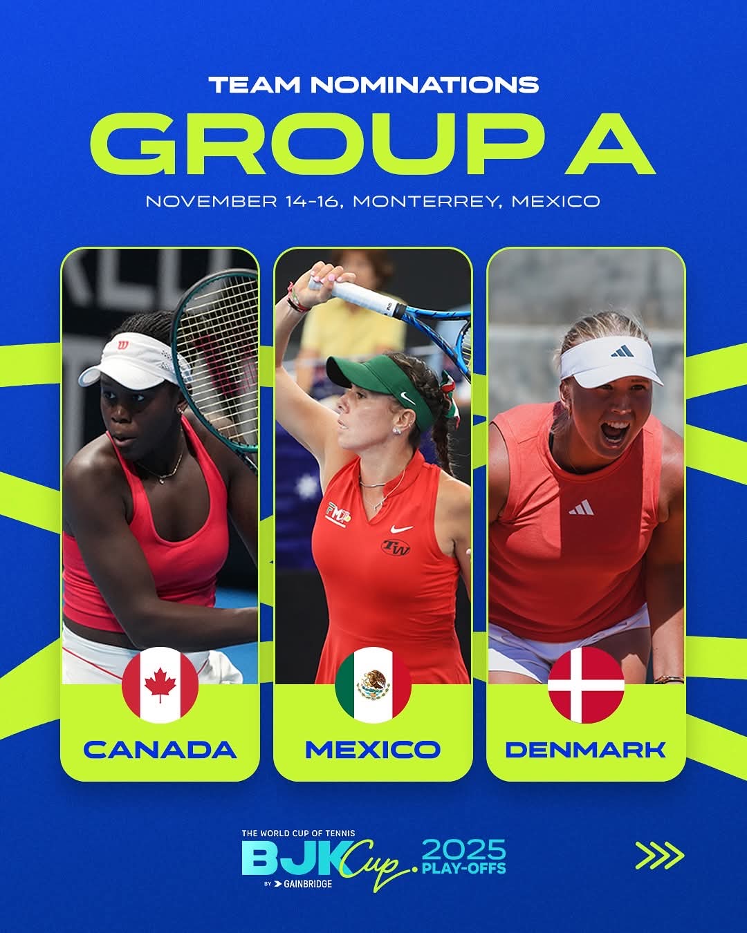 El día de hoy fueron anunciadas por la Federación Internacional de Tenis, las nominaciones de los equipo de México, Dinamarca y Canadá, quienes conforman el Grupo A de la Billie Jean King Cup, que disputarán los Playoffs 2025 de la Billie Jean King Cup por Gainbridge en Monterrey, Nuevo León, del 14 al 16 de noviembre.