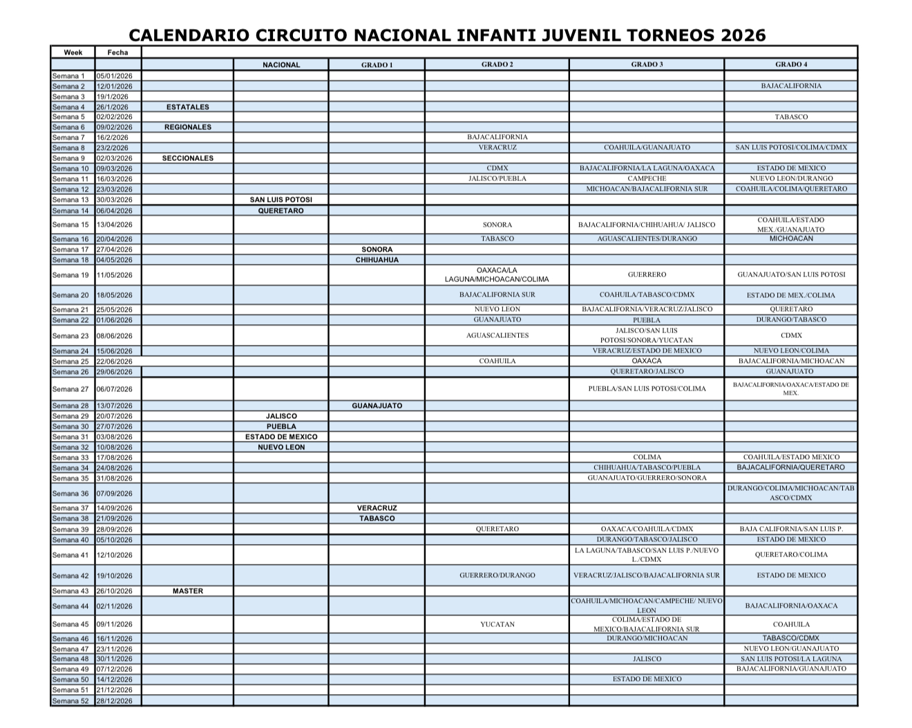 CALENDARIO CIRCUITO NACIONAL INFANTIL JUVENIL TORNEOS 2026