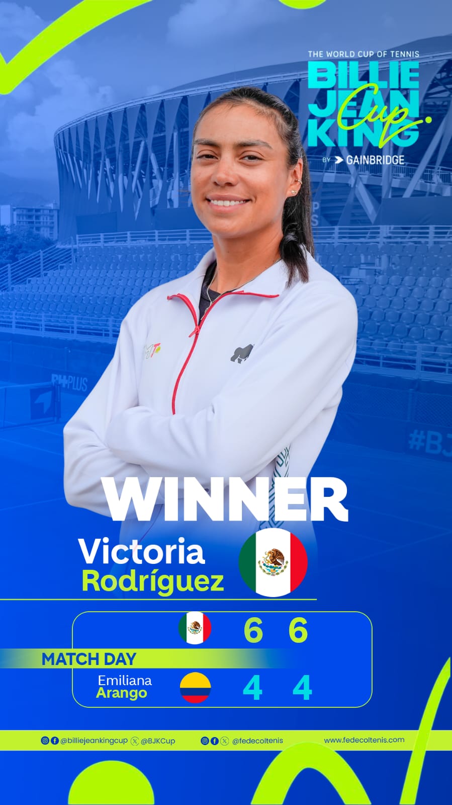 El equipo mexicano consiguió su segunda victoria en las eliminatorias del Grupo I Zona de las Américas de la Billie Jean King Cup, luego que Victoria Rodríguez derrotó en sets seguidos 6-4, 6-4 a la top 100 del mundo, Emiliana Arango, para doblegar al equipo anfitrión 2-0.